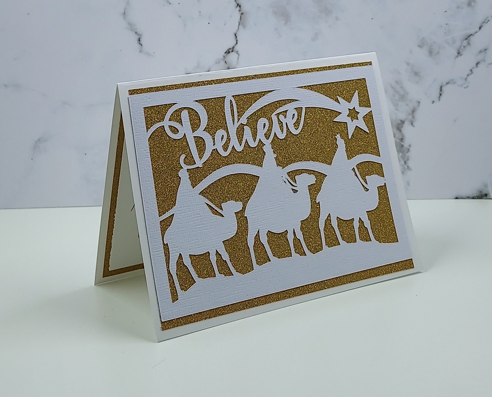 This religious Christmas card is an original handmade card with an intricate cut out design, gold glitter background and stamped message on quality cardstock. The card is a perfect Christmas card. Our cards are cut and assembled by hand with attention to detail.