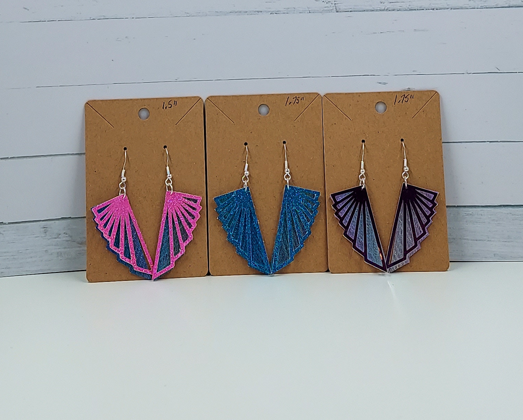 These chic double-layer handmade Fan Earrings are created from one sided faux leather. The faux leather for each layer was specifically selected to complement each other. There is a gorgeous faux leather pattern material on the bottom layer with a solid layer for the top. Together these are stunning and are perfect for wearing everyday. These earrings are so light-weight you may even forget you have them on!